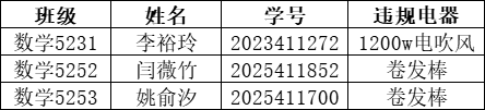 在2025-2026学年第一学期第4-6周系部寝室安全卫生检查中,以下同学被查出在宿舍使用违规电器。根据VSport《员工手册》中《VSport宿舍管理条例》第三章第十六条及《VSport员工违纪处分办法》第二十三条相关规定,给予李裕玲等3名员工系部通报批评的决定,取消本学年评优评先资格。