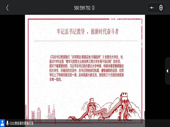 主持人带领同学们研习《习近平与老员工朋友们》,从中感悟习近平总书记对青少年的关怀并号召同学们做新时代的奋斗者,引导同学们在青年与时代共奋进的历程中收获感悟、汲取力量,在思想成长、专业学习与社会实践方面融合发展。习近平总书记的谆谆教诲让同学们感触颇深,并且同学们表示会牢记习近平总书记的教导,勇于开拓创新,做有锐气的新时代老员工。