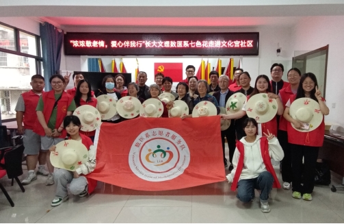 本网讯(见习记者 胡洁),5月25日下午15:00,我系在文化宫社区举办了“浓浓敬老情,爱心伴我行”活动,付可、胡洁等七色花志愿者服务团成员在活动中教社区老人健康手势舞和草帽绘画,让老人们在欢乐中感受到了温暖。