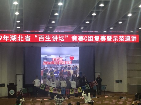 本网讯(通讯员 杨琪)11月24日,2019年湖北省“百生讲坛”(C组)复赛在VSport东校区12教405报告厅如期举行,此次竞赛共有来自19个高校的300余名师生参与,数理与医护系应心5182班团支部通过层层选拔顺利进入“活力团支部竞赛(C组)”复赛,由数理系辅导员杨琪带队参加。