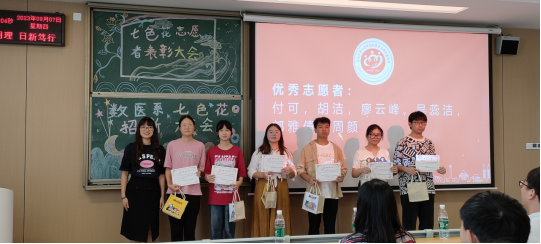 9月7日下午,我系七色花志愿团招新暨表彰大会在教学楼A 410顺利举行。参加本次会议的有数学与医护系党总支副书记李娜、辅导员李佳和聂志、优秀志愿者代表及2023级全体新生。