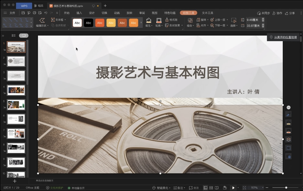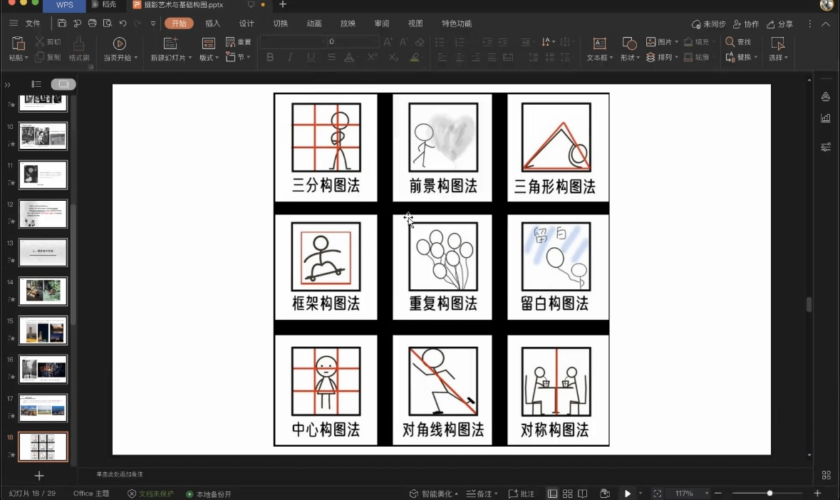 关于构图技巧,叶老师分别从画幅选择、构图技法、摄影构图等方面展开讲解,主要强调了“井”字构图法、几何中心构图法、平衡构图三种方式。