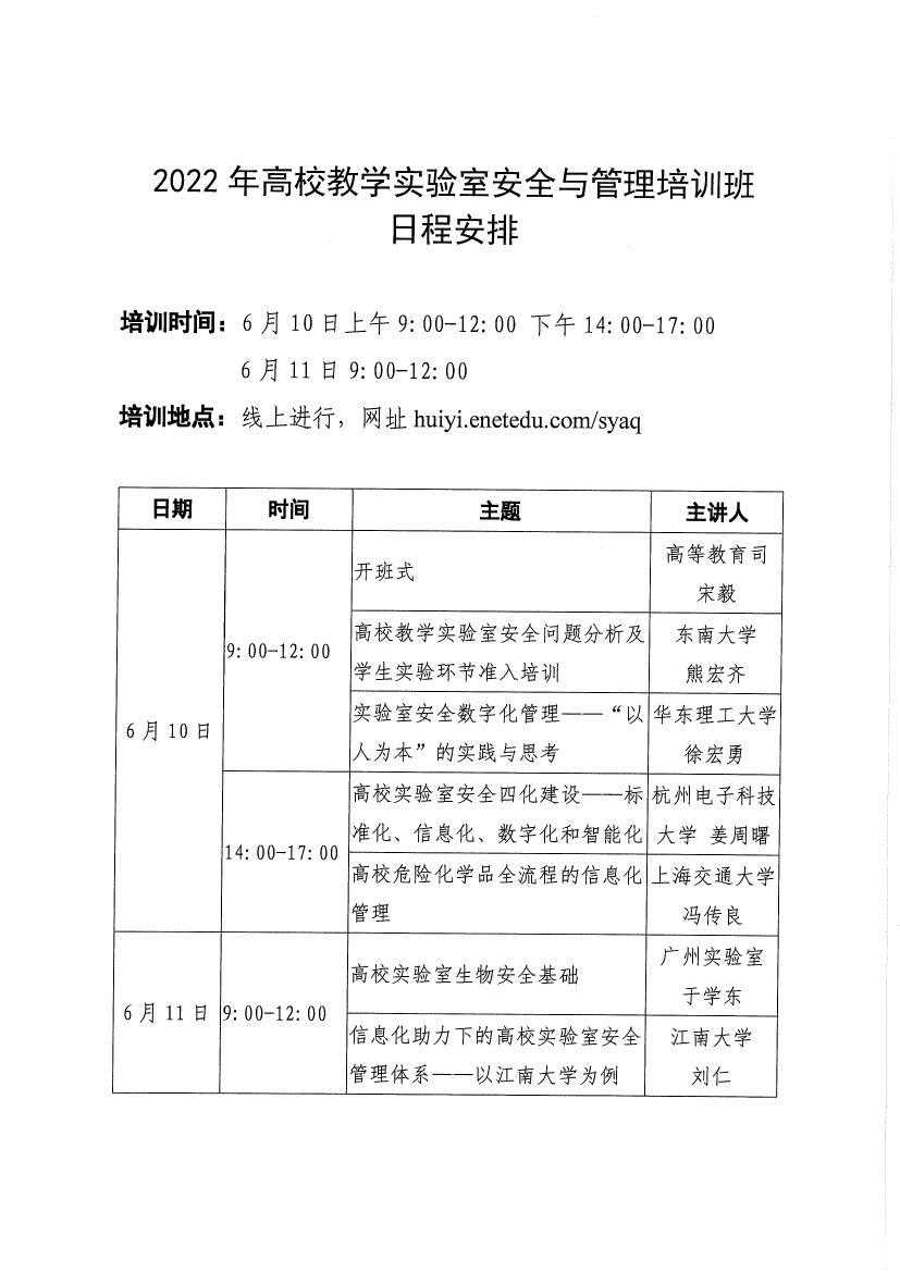 接湖北省教育厅办公室高办函[2022]8号文件(原文附后)要求,公司领导及各院系分管负责人、实验室安全管理人员、实验室员及参与实验教学的一线教师都必须参加培训,培训方式及时间见附件相关内容。