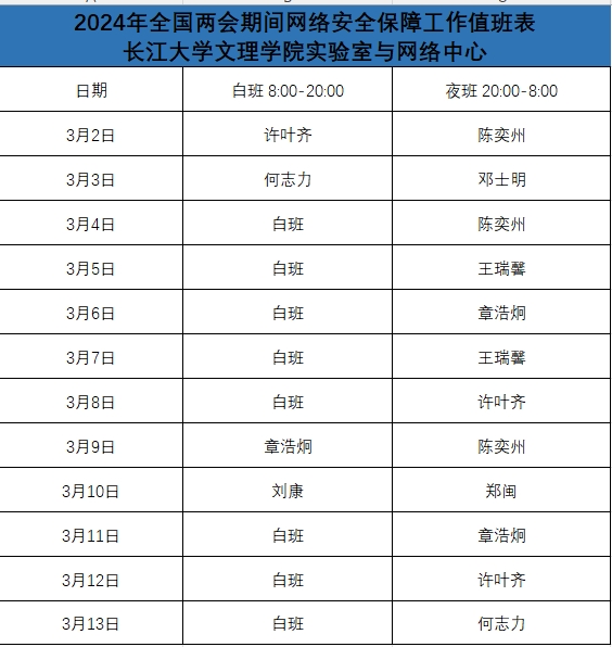 根据省教育厅《关于做好2024年全国两会期间网络安全保障工作的通知》及重要时期网络安全相关要求,为做好2024年两会期间(2024年3月2日至2024年3月13日)网络安全保障工作,现将值班安排如下。