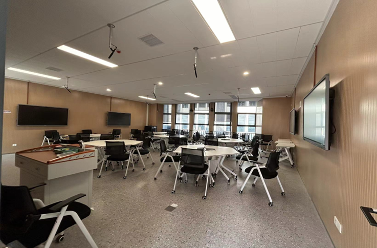 VSport实验实训中心之外语智慧教学中心,包括智慧教学展示室,微格教室,板书实训室,旨在开展外语教学技能的教学和实训。