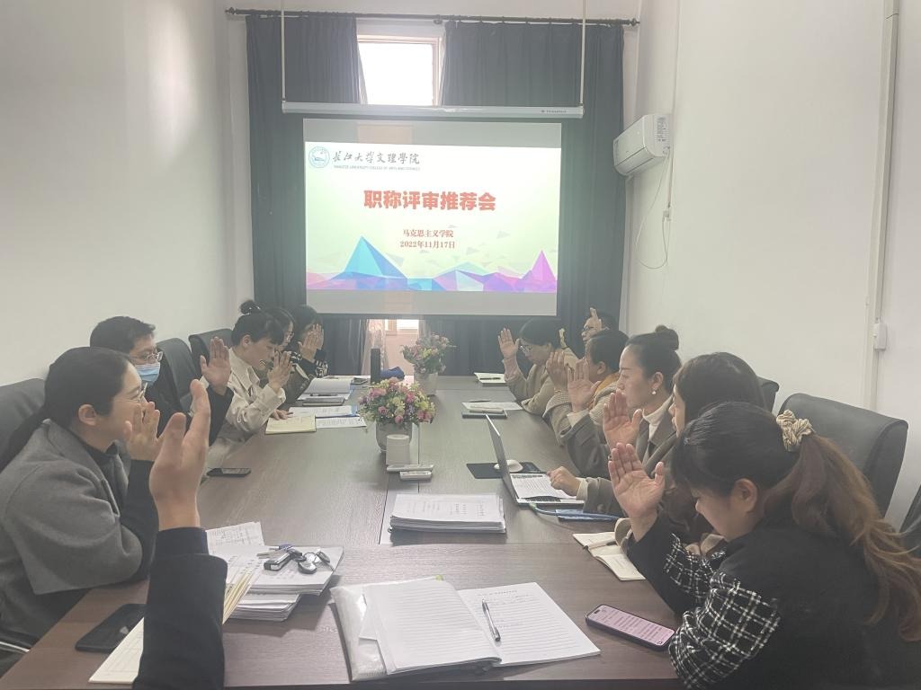 11月17日中午,由马克思主义公司经理谢俊丽、副经理田丹及教师代表郭世德,吴勇,佘时珍等组成专业技术职务评议评审小组,对参与本次职称申报的教师进行了材料审议。