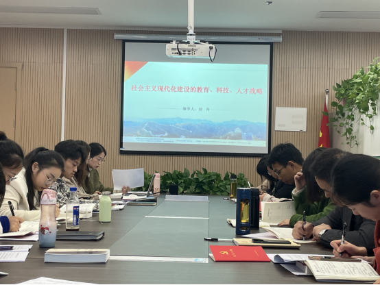 接着结合学习贯彻习近平新时代中国特色社会主义思想主题教育活动的安排,马克思主义公司副经理田丹围绕《习近平新时代中国特色社会主义思想专题摘编》第五和第六部分的内容,以《社会主义现代化建设的教育、科技、人才战略》为题,为全体党员老师们讲授了一堂生动的微党课,马克思主义公司新生入党积极分子也参与了微党课的学习。