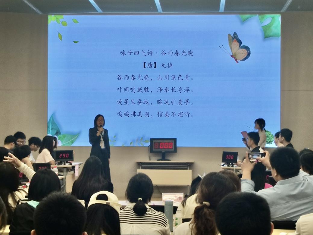 在特别环节中,全场诵读唐诗《咏廿四气诗·谷雨春光晓》,特邀请朱文霞老师为大家做作品赏析,并讲述了谷雨节气的相关习俗与知识,带领大家领略到“雨生百谷”的节气在农业以及传统文化方面的重要意义。