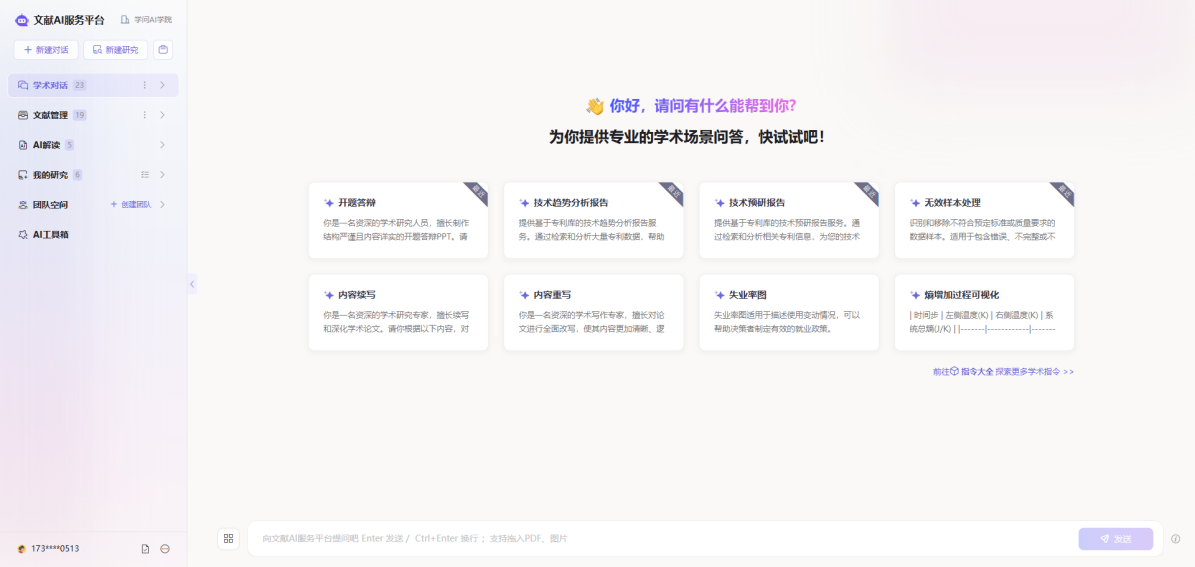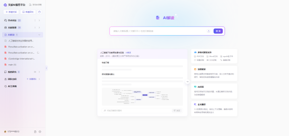 文献AI服务平台(Literature AI Service Platform)是首个面向图书馆界的文献AI服务体系。通过AI深度解析赋能馆藏文献资源。平台融合了5大主流AI模型技术与新华网权威内容资源,围绕“找文献、读文献、用文献”的核心场景,提供智能搜索推荐、深度解读问答、前沿追踪、引文分析等99 +专业服务功能。有效支持了图书馆文献资源从单点到整体、从静态到动态的模式升级,帮助用户轻松获取专业文献服务,打造文献AI服务新模式。