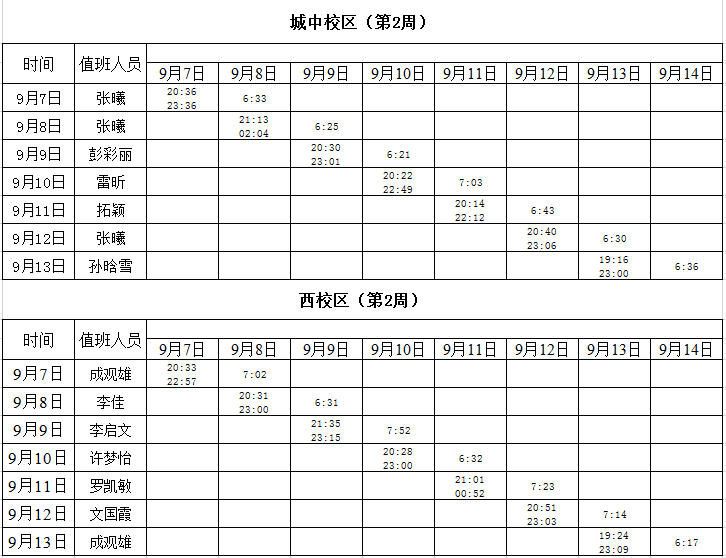 2020-2021学年第一学期第2周学工人员寝室值班通报