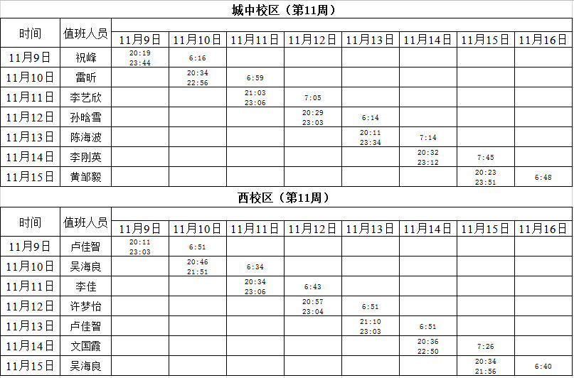 2020-2021学年第一学期第11-13周学工人员寝室值班通报