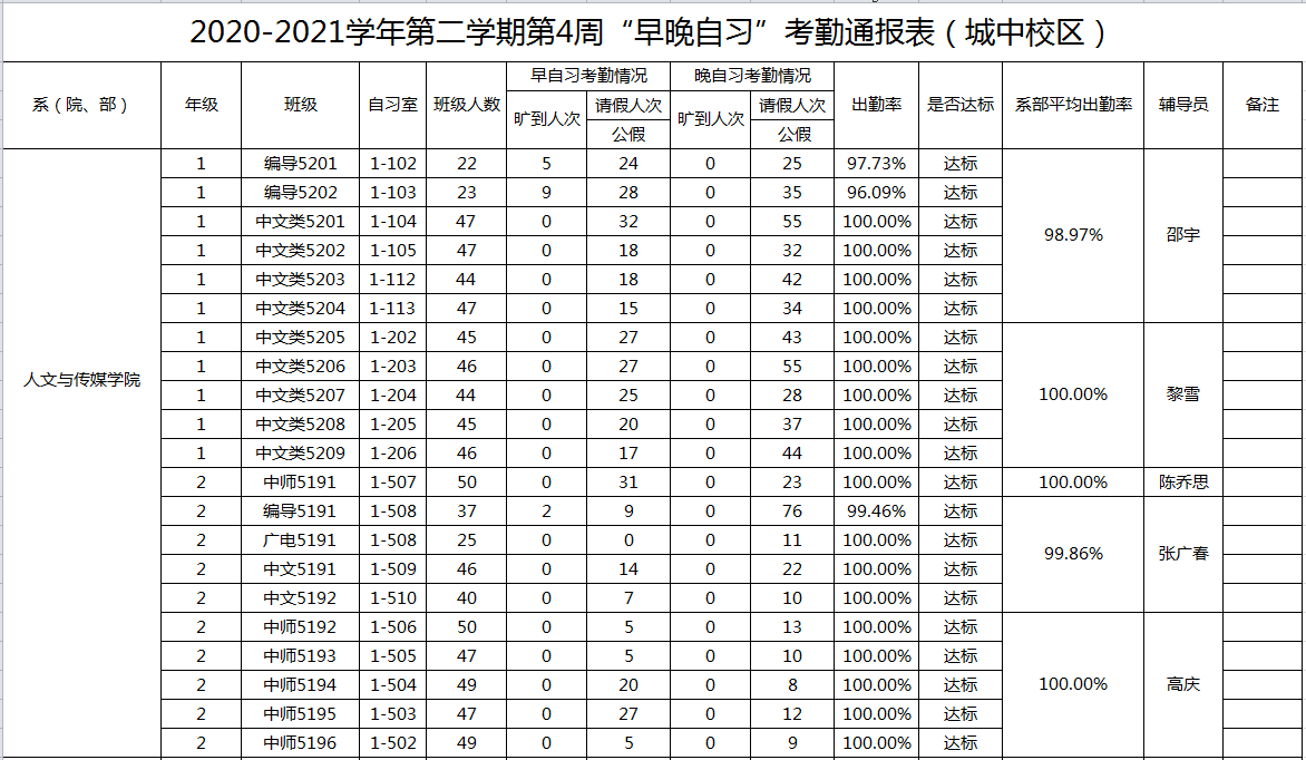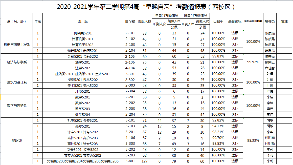 2020-2021学年第二学期第4周系(院、部)早晚自习考勤通报