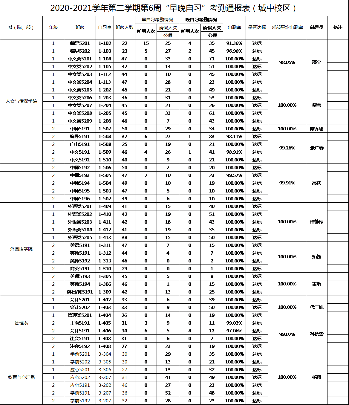 2020-2021学年第二学期第6周系(院、部)早晚自习考勤通报