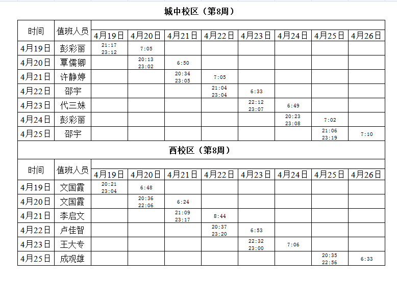 2020-2021学年第二学期第8周学工人员寝室值班通报