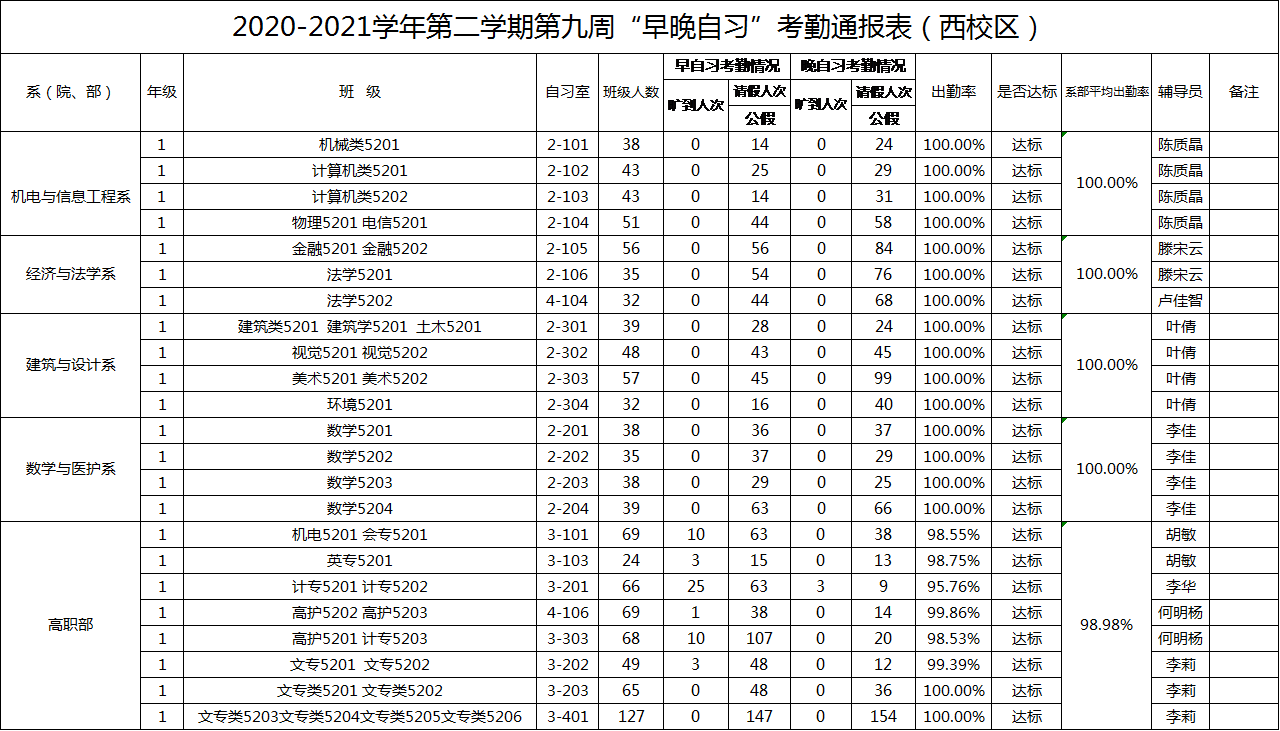 2020-2021学年第二学期第9周系(院、部)早晚自习考勤通报