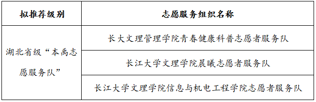 根据《湖北省“本禹志愿服务队”创建活动管理办法(修订)》要求,经自主申报、资格审查、组织评审等环节,经校团委、校志愿服务总队研究决定,报分管领导确定,拟推荐长大文理管理公司青春健康科普志愿者服务队等3个志愿服务组织参与2023年度省级“本禹志愿服务队”评选。具体名单公示如下(以下排名不分先后):