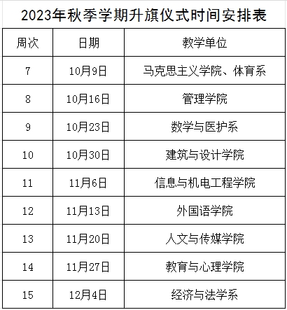 七、参加人员:全院大一新生、负责升旗仪式教学单位的教师及全体员工(根据实际情况自行安排)