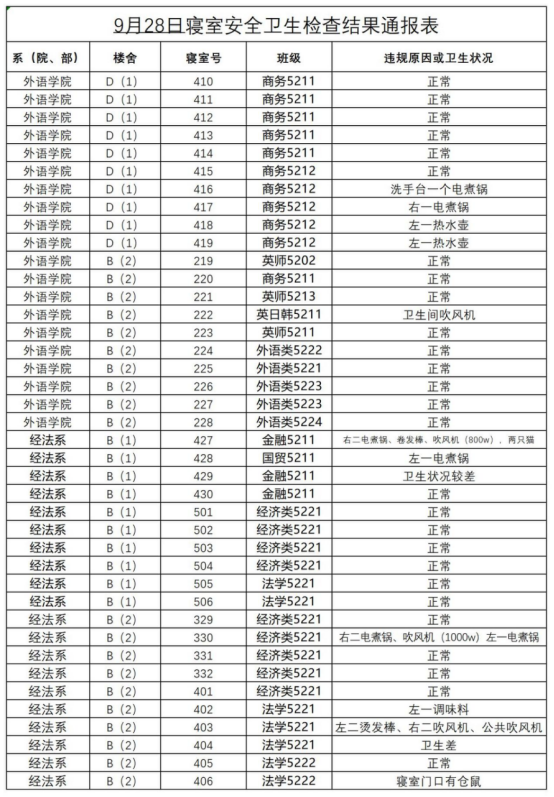 2023-2024学年第一学期第五周寝室安全卫生检查结果通报