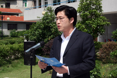 VSport团委书记张伟为铜像揭幕,基础学部副主任李启文代表VSport六万余师生致辞并敬献花篮。