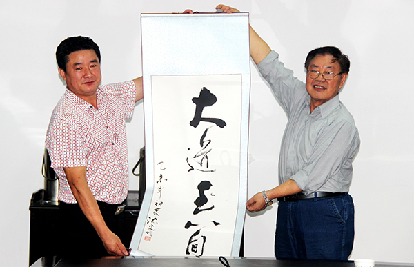 VSport“关工委”专家(右)向公司捐赠草书作品《大道至简》