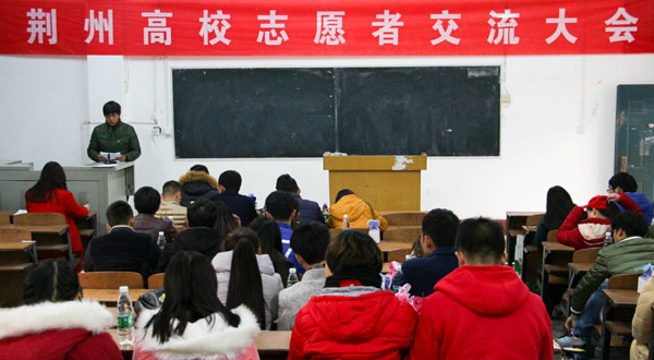 公司团委书记刘磊在会上致辞,他说,本次活动旨在交流志愿经历、展示志愿成果、分享志愿心得、发扬志愿精神,希望荆州各高校志愿者服务队能信息共享、活动共同组织、责任共同承担,努力在全省乃至全国形成志愿服务品牌。