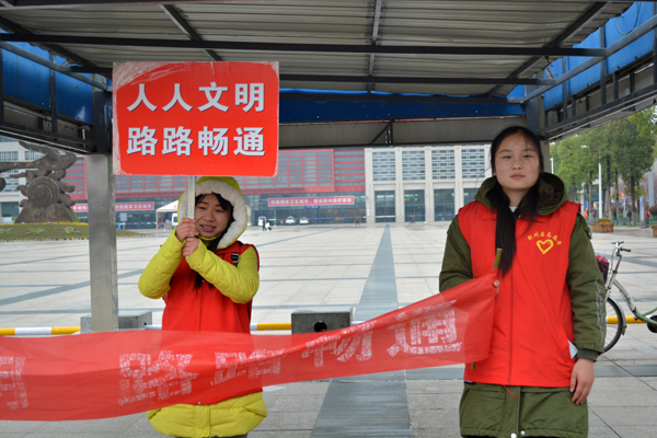 在火车站前红绿灯路口处,外国语系英师5163班黄知玲、人文与传媒系中师5163綦梅手和脸被冻得通红,从早上730开始,一直到下午5点,她们不畏寒风,坚持举起“人人文明 路路畅通”的标识牌,拉着劝导文明交通的横幅,劝导行人不要随意横穿马路、注意避让车辆、走路时不要低头玩手机。