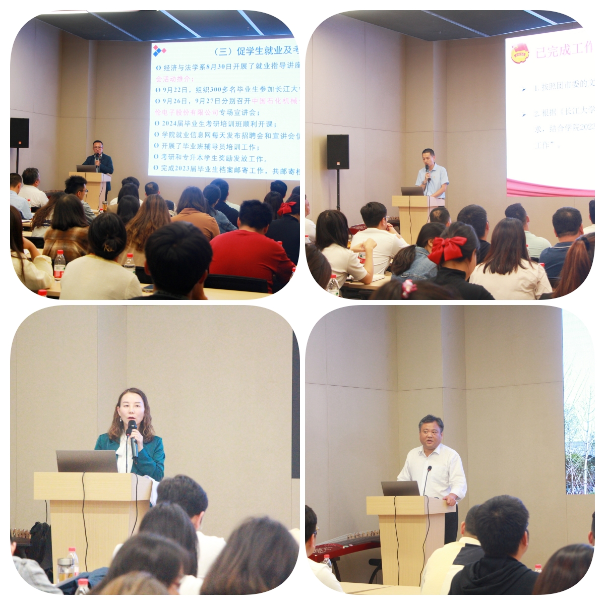 在专题交流分享环节,经济与法学系党总支副书记杨杉杉从组织建设、政治定力、团青活力三个方面做了《打造系部特色亮点 精心服务同学》特色工作分享报告。辅导员卢佳智以《用心伴员工远行—做一名新时代合格辅导员》为题,结合自身四年工作心得,从四“心”出发,助力员工健康成才,用功、用心、用情服务员工成长发展。