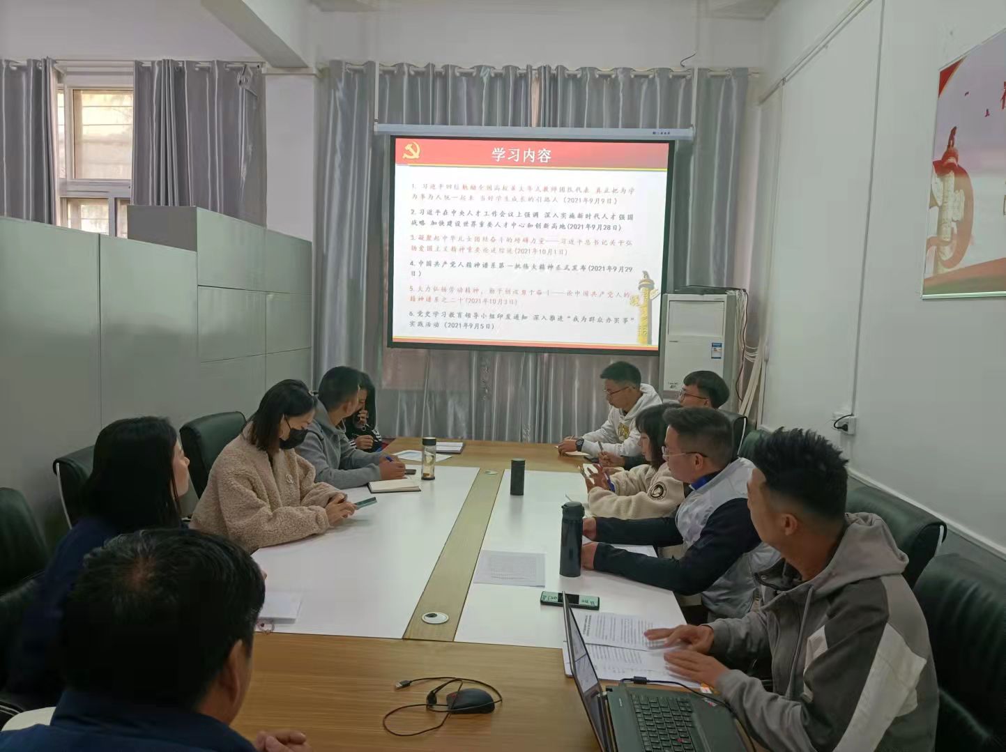随后系部教工党支部开展了10月支部“主题党日”活动。会议由党支部书记主持。会上,全体党员重温了入党誓词,诵读了党章《总则》,开展了《中国共产党简史》的学习,重点学习了第五章“中华人民共和国的成立和社会主义制度的建立”相关内容。会上,大家还一起学习了习近平总书记在中央人才工作会议上的讲话、习近平总书记关于弘扬爱国主义精神重要论述综述,以及中央党史学习教育领导小组印发的《关于深入推进“我为群众办实事”实践活动的通知》,学习了省纪委机关、省委教育工委、省教育厅《关于推进清廉公司建设的实施意见》。