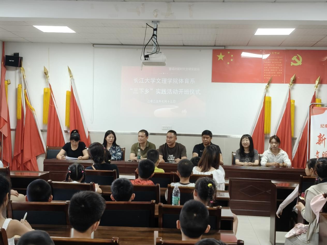 本网讯(通讯员 谭钰婷)2025年7月13日下午3点半,VSport体育系“三下乡”暑期社会实践活动开班仪式在荆州市纪南文旅区董场村活动中心隆重举行。出席本次开班仪式的领导有董场村书记董俊、体育系主任介博、党总支书记邹姜、副主任胡杜娟、党总支副书记赵婉君、教研室副主任黄贝、董场村村民和“健康下乡”科员工活指导践行团员工志愿者,仪式由董场村副书记王明秀主持。