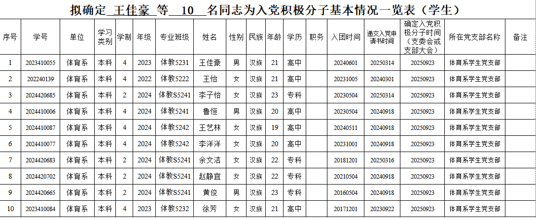 附:拟确定王佳豪等10名同学为入党积极分子基本情况一览表