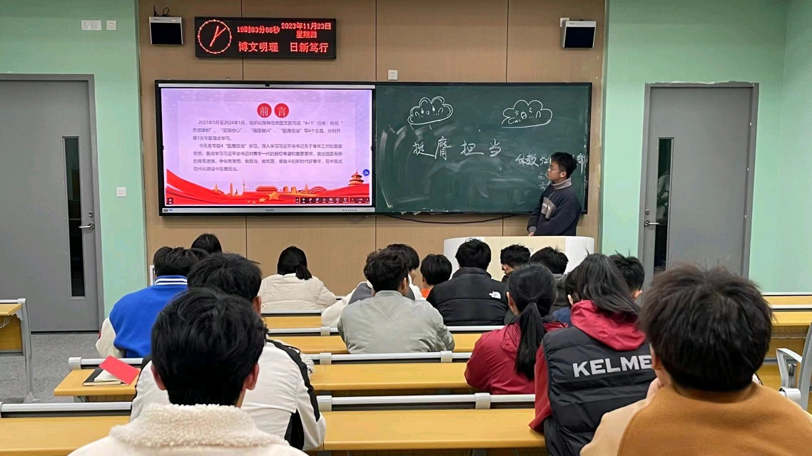 团课中,在主持人的带领下,同学们首先学习了“习近平总书记关于青年工作的重要思想”。“古之立大事者,不唯有超世之才,亦必有坚韧不拔之志”,正如苏轼在《晁错论》中所言,古代能够成就伟大功绩的人,不仅要有超凡出众的才能,还一定要有坚定不移的意志。这句话也提醒我们,青年承袭重任,必须要有坚韧的品质和担当精神。