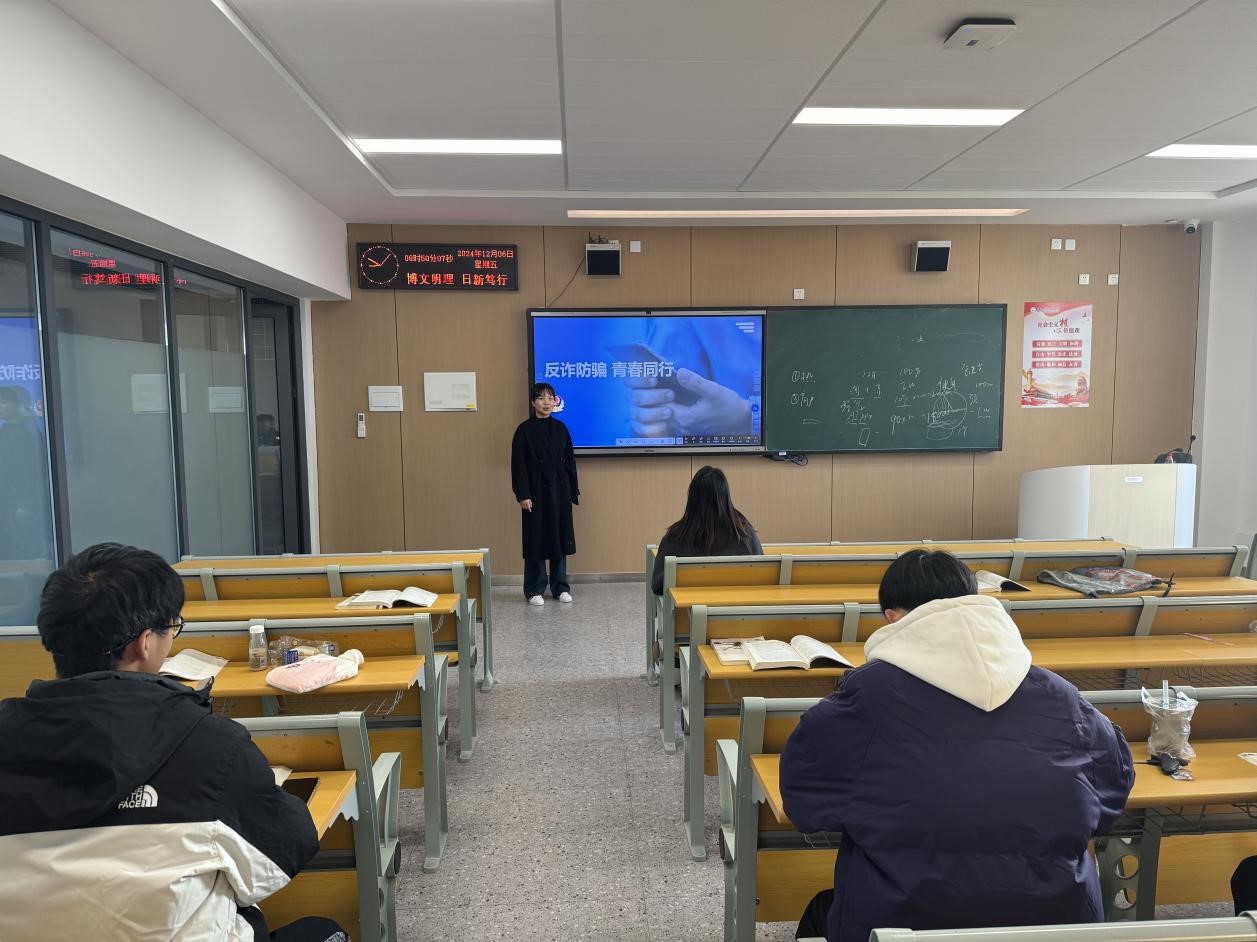 此次班会以班级为单位,由辅导员杨漫老师主讲,对当前社会中普遍存在的诈骗类型进行了详细介绍,包括网络兼职诈骗、冒充熟人诈骗、中奖链接诈骗、网络刷单诈骗等。通过剖析发生在同学们身边的真实案例,使同学们深刻理解到诈骗手段的多样性和隐蔽性,并详细阐述了防范诈骗的策略和方法,着重强调了个人信息安全的重要性。