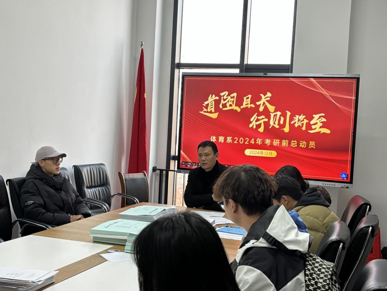 本网讯(通讯员 杨漫)随着考研倒计时的钟声日益临近,体育系于2024年12月17日下午4点半在系部会议室举办了考研考前动员大会。此次大会旨在激发体育系考研员工的斗志,提供备考策略指导,并为他们加油鼓劲,助力他们在即将到来的考研战役中取得优异成绩。