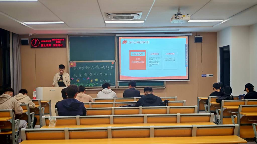 活动伊始,各班主讲人带领同学们共同学习了抗战历史的重要节点和英雄事迹,生动讲述了中华儿女在那段烽火岁月中展现出的天下兴亡、匹夫有责的爱国情怀,视死如归、宁死不屈的民族气节,不畏强暴、血战到底的英雄气概,百折不挠、坚忍不拔的必胜信念。随后,大家围绕如何将抗战精神融入日常学习与生活展开了热烈讨论,纷纷表示要以实际行动传承红色基因,勇担时代使命。