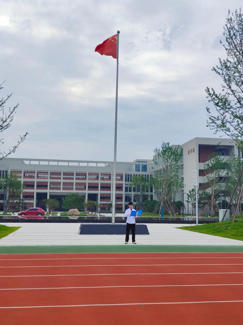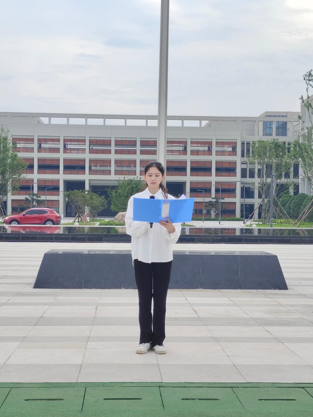 6点55分,随着主持人宣布升旗仪式正式开始,国旗护卫队队员们踏着矫健的步伐将五星红旗护送至升旗台,于7点整准时奏响国歌,在全体师生的注目礼下,五星红旗冉冉升起,迎风飘扬。