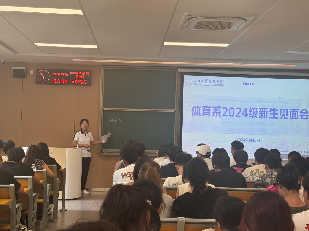 本网讯(通讯员 赵婉君)为促进新生更快融入老员工活, 9月8日上午9点,体育系在教学楼A-102教室召开了2024级新生见面会。体育系主任介博、党总支书记邹姜、副主任胡杜鹃、党总支副书记赵婉君、辅导员杨漫、新生班主任王崟麒、辅导员助理王亚飞参会。会议由副书记赵婉君主持。