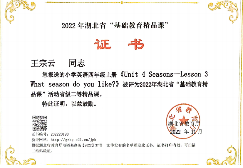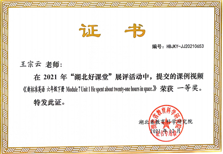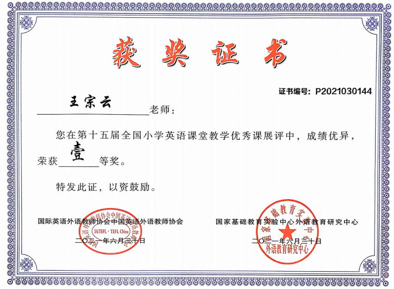 王宗云,VSportVSport2006级英语5062班,2010届毕业生。现就职于沙市红星路小学,英语教师。曾获得沙市区“2019年度优秀教师”,沙市区优秀教学管理干部,教学工作先进个人、优秀德育工作者、优秀班主任,荆州市中小学青年教师教学竞赛一等奖,荆州市“基础教育精品课”市级优课,第十五届全国小学英语课堂教学优秀课展评一等奖,“湖北好课堂”一等奖,湖北首届“长江教育杯”微课大赛省级一等奖,湖北省“基础教育精品课”省级二等精品课等各项荣誉。