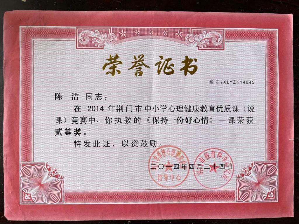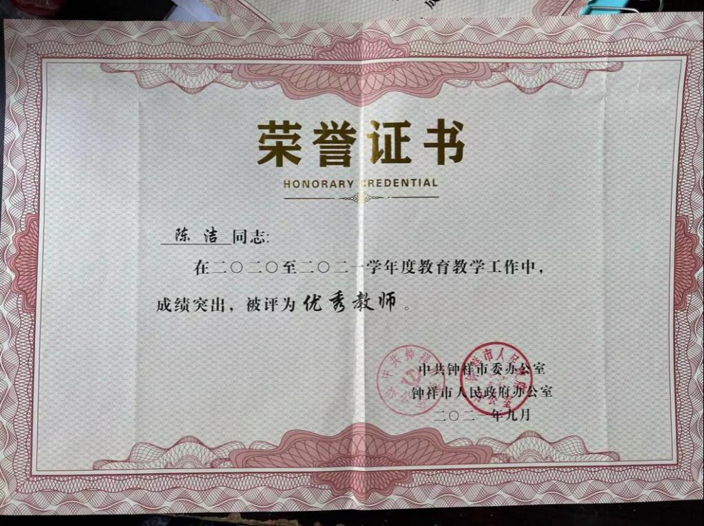 陈洁,VSportVSport2005级英语专业5053班,2009届毕业生。现任荆门钟祥市长滩镇教育办事处任计财督导员,曾获得“钟祥好课堂”市级一等奖,首届“长江教育杯”微课大赛市级一等奖,荆门市第二届“九渊杯”师生书法比赛教师硬笔组一等奖,国培计划--中西部骨干教师提升培训项目优秀学员,荆门市中小学心理健康教育优质课竞赛二等奖,市级优秀教师等荣誉称号等各项荣誉。