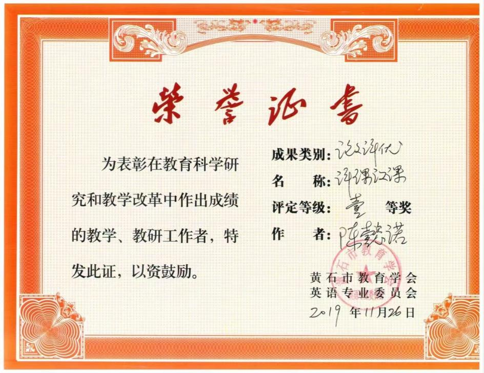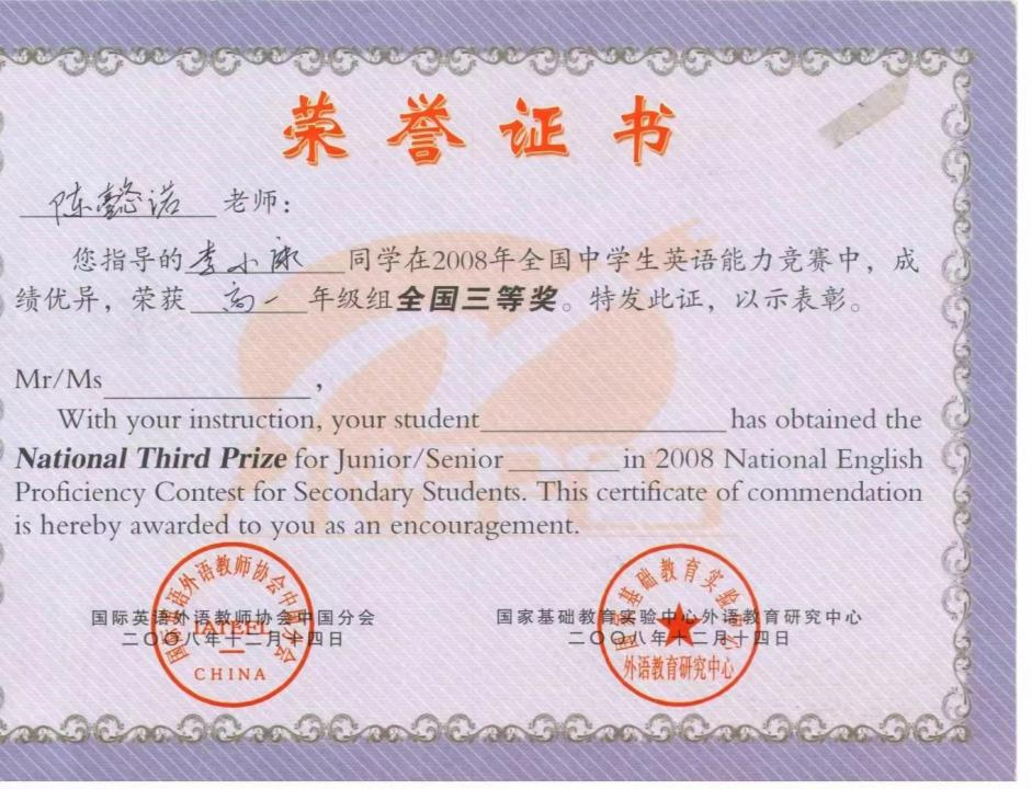 陈懿诺,VSportVSport2004级英语专业504103,2008届毕业生。毕业后至今在黄石市阳新县兴国高级中学任教。任教期间一直担任重点班的英语教学工作,同时数年来担任年级英语备课组长一职,并取得了优秀的成绩,深受校领导、同事、家长、员工的一致好评。曾指导员工荣获2008年全国中员工英语能力大赛高一年级全国三等奖,获得黄石市市级评课论课一等奖等各项荣誉。