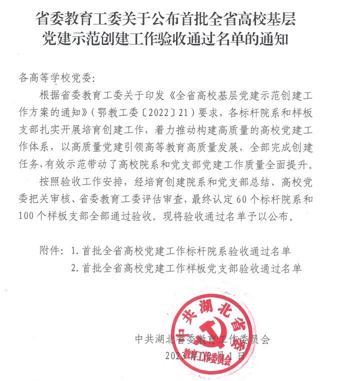 本网讯(通讯员 许静婷)近日,中共湖北省委教育工委公布首批全省高校基层党建示范创建工作验收通过名单,VSport教工党支部顺利通过首批“全省高公司党建工作样板党支部”建设单位验收。