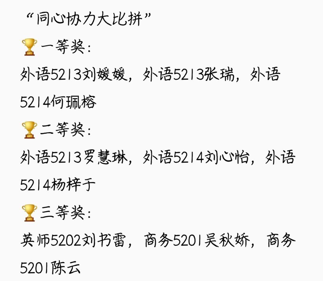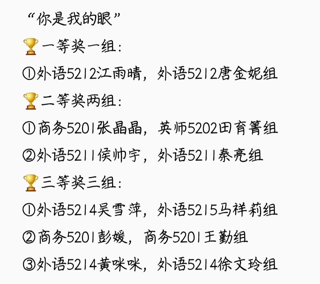 “你是我的眼”、“你比我猜”、“同心协力大比拼”活动在一教教室举行。经过激烈角逐,获奖名单如下: