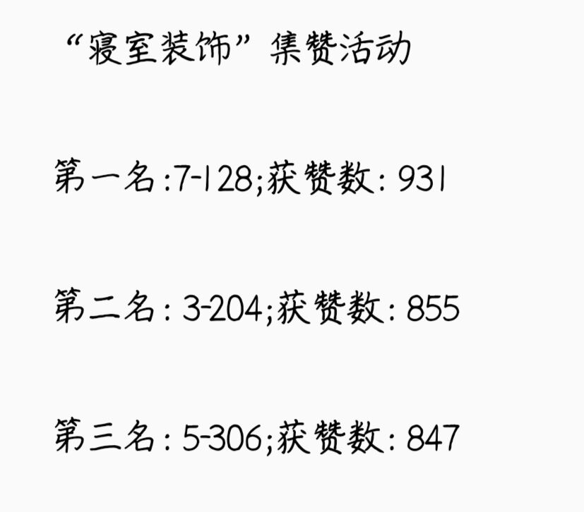 “寝室装饰”活动通过线上集赞的方式评选,获奖名单如下: