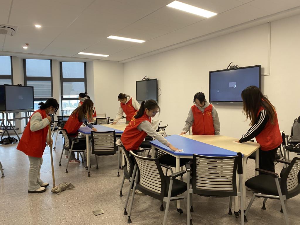 活动现场,主要对教室地面、讲台、书桌进行全方位清洁,并针对教室灰尘死角、杂物垃圾进行了重点清理,同时将桌椅摆放整齐。在清洁过程中,员工会干部积极配合安排,认真打扫,清理垃圾,不怕苦不喊累,齐心协力,相互配合,最终顺利地完成清扫任务。经过清扫,教室干净整洁,焕然一新。