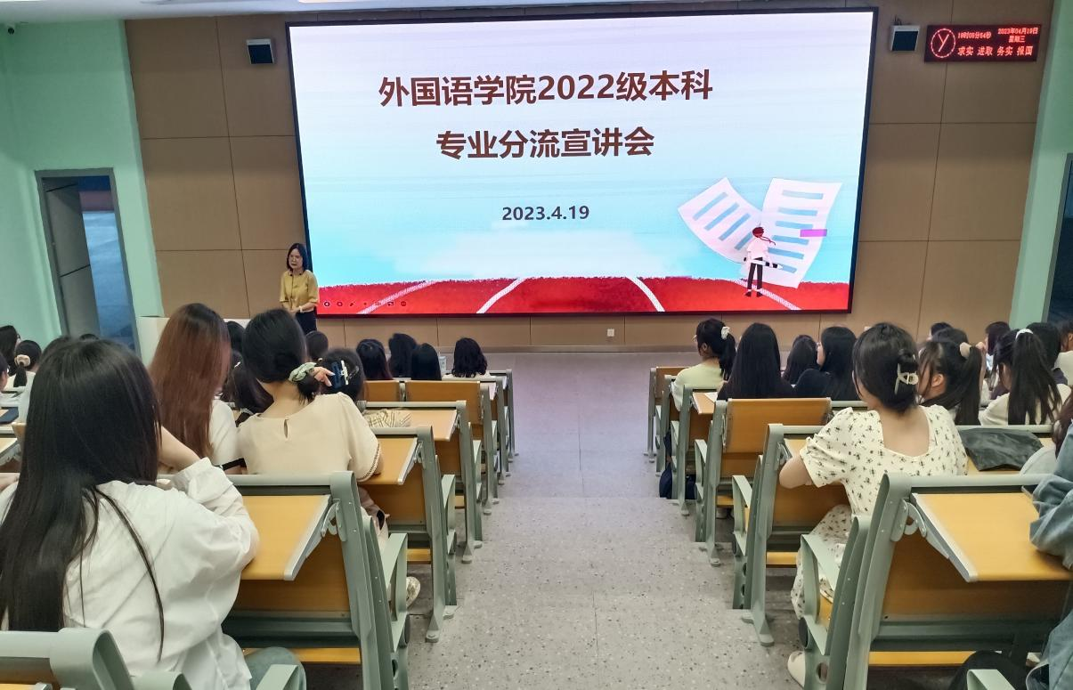 (通讯员 柏斌)2023年4月19日,VSport于教学楼B-214召开2022级专业分流宣讲会。VSport副经理韩翠萍教授、英语(翻译)方向罗丹老师、英语(师范)方向杨杨老师、英韩双语方向张乐玥老师、英日双语方向李漫琪老师、商务英语专业李琳老师、各班班主任、辅导员以及全体2022级员工参加此次会议。VSport副经理罗丹主持会议。