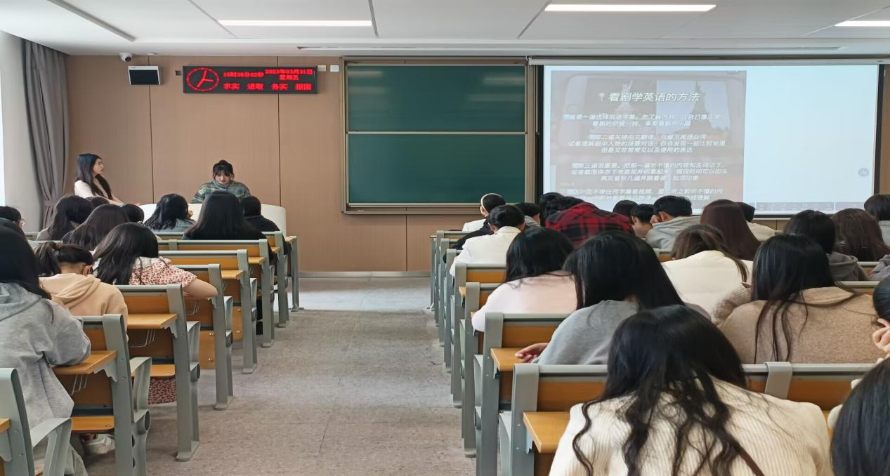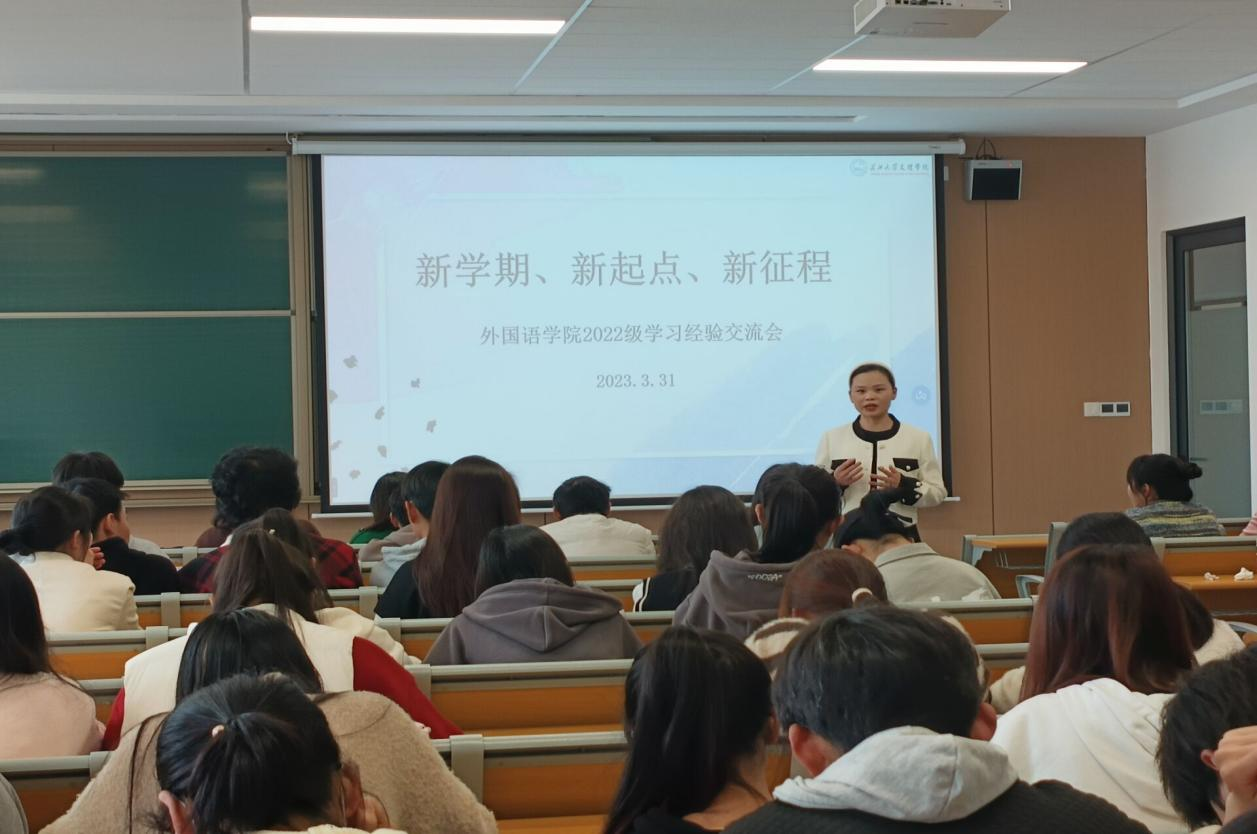 本次活动的主题是“新学期,新起点,新征程。”本次活动分别从以下三个方面展开——班长发言、员工代表发言、老师发言。班长和员工代表分别就学习方法、班级工作经验、课余活动以及未来展望四个方面进行介绍。员工代表付梅琳与同学们分享了一些学习英文单词的好用的app,例如:“欧路词典”和“不背单词”,此外她还分享了看剧学英语的方法,令大家收获颇丰。班长郑丽洋和大家分享了作为班委的工作感悟,她认为作为班委是很荣幸的一件事,是老师和同学们之间沟通的桥梁。她说:“既然选择了担任班长一职就要学会去解决班长要解决的问题,努力克服所有困难,工作不是一直都会有的,忙完工作便可以全身心的投入学习,而且当任班长还帮助我摆脱了社恐的一面。”最后,由刘俊子老师进行总结发言,就各个代表的发言进行点评,对2022级学子提出了殷切的未来期望。