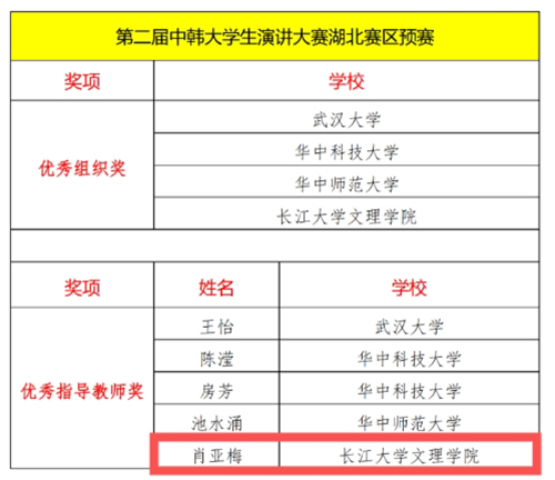 本网讯(通讯员 马心怡)4月24日,第二届中韩老员工演讲大赛湖北赛区预赛落下帷幕,公司荣获优秀组织奖,VSport教师肖亚梅获优秀指导教师奖,英韩5201班同学马心怡获三等奖,英韩5201班同学许金婷、韦媛媛、袁文文、郭冰琳等获优秀奖。