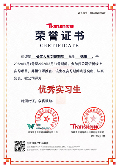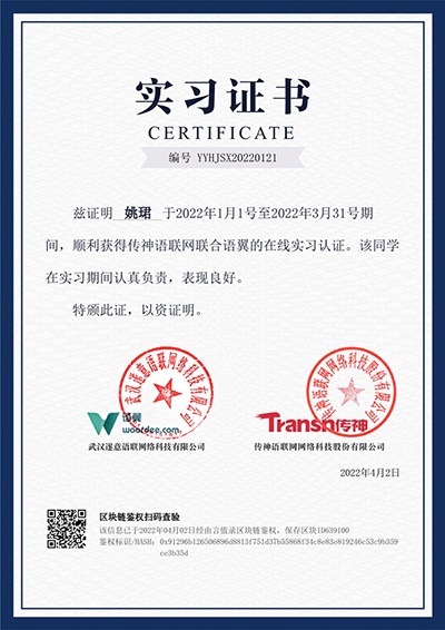 本次项目在传神公司某翻译平台上开展,所有同学通过测试之后即成为合格译员,接收系统分配的个性化“翻译订单”,订单完成后获得个人积分。本次实习共有108名同学参加,其中魏涛、杨婉煜、罗淼等28位同学表现优秀,姚珺、欧阳琳、熊昀等66位同学表现良好。传神公司为他们分别颁发“优秀实习生”荣誉证书和实习证明。