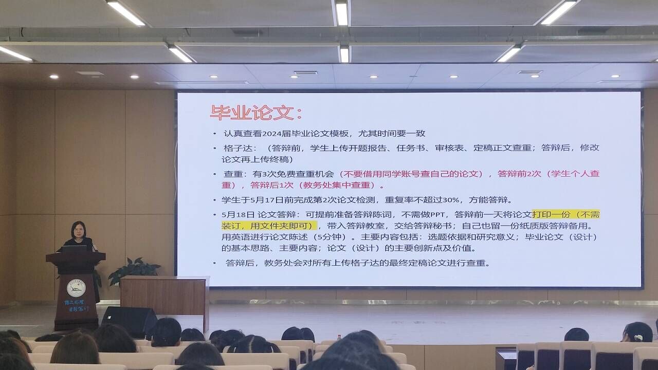 随后,罗经理就毕业生实习、毕业论文等教学工作进行详细讲解,希望每一位同学不忘初心,继续以饱满踏实的工作热情投入到工作岗位中,从而实现自己的人生价值。韩经理以“外”、“国”、“语”三个关键字寄语毕业生,希望毕业生们在人生的新阶段继续扬帆远航。