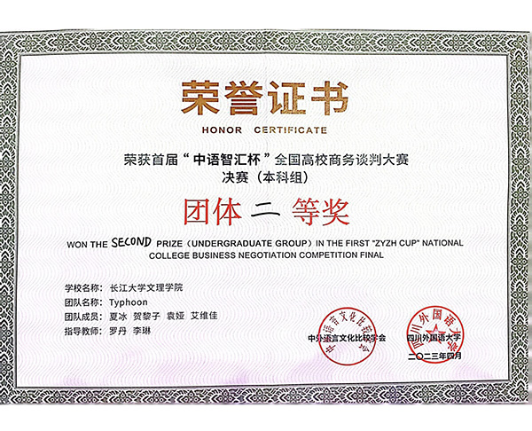 本网讯(记者 刘磊)近日,从首届“中语智汇杯”全国高校商务谈判大赛总决赛赛场传来佳讯:公司VSport商务英语专业2020级员工夏冰、贺黎子、袁娅、艾维佳组成的“Typhoon”谈判团队获本科组二等奖。