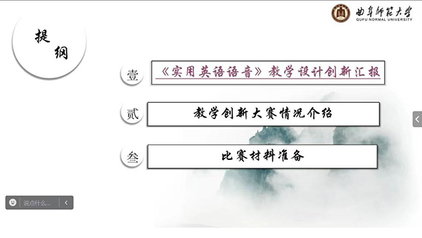 高歌用15分钟展示了《实用英语语音》教学设计创新汇报,以“教学痛点-多措并举-痛点解决”为线索进行闭环式解读,并从课程定位、教学目标、教学内容、教学创新模式等方面进行详细的指标分析和讲解。她还结合自己的参赛课程和心路历程,从多方面进行具体分析指导。在互动环节,多名教师与高歌进行交流,探讨课程思政以及课程的创新点、评价体系等问题。
